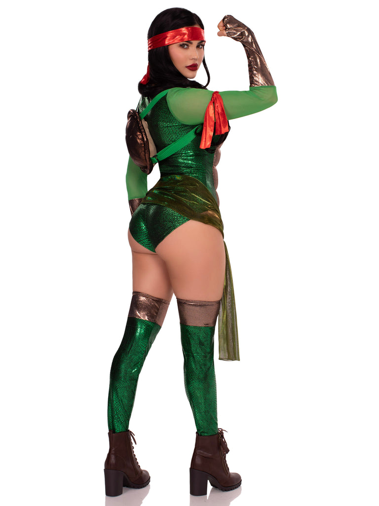 12 PC Renegade Ninja Hero Costume, Includes Bodysuit with Padded Abs, Waist Sash, Footless Thigh Highs, (4) Headbands, (4) Arm Bands, and Shell Backpack