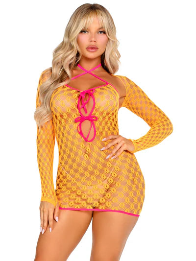 2 PC Eyelet Net Mini Dress with Tie-Front Keyhole Detail and Shrug