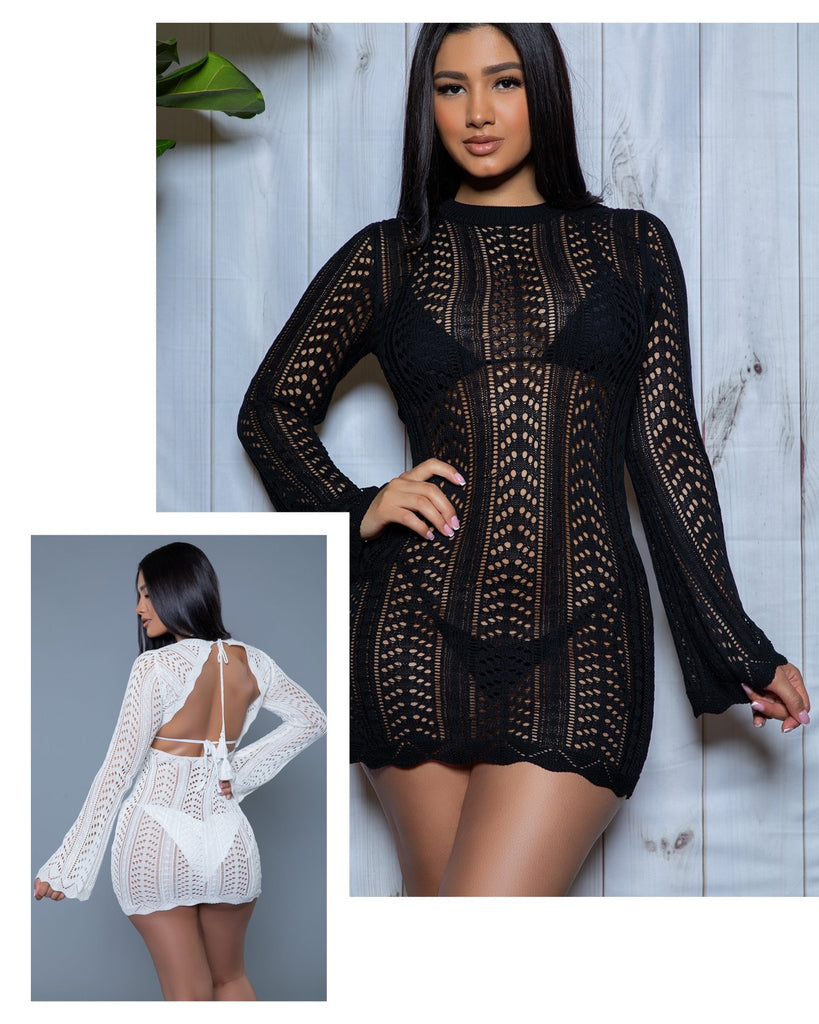 Add a touch of elegance to your beachwear with our Kinsley Crochet Mini Dress Cover-Up. This beautifully handcrafted piece is designed to keep you stylish and comfortable during those sunny beach days. It's great to pair with your favorite bikini. Round high neckline Long bell sleeves Scalloped crochet trim Back tie Open back Turn inside out before cleaning, wash with similar colors. After washing remove promptly and hang. Color may fade with prolonged exposure to light and chlorinated water. Be Wicked Polybag Packaging 100% Polyester Made in China