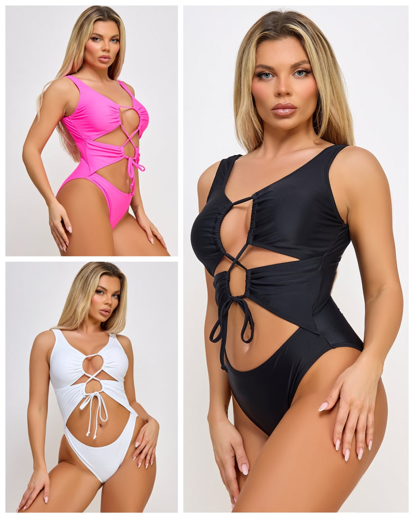 Channel timeless elegance with the Valery One-Piece Swimsuit, featuring a captivating lace-up front design that perfectly blends sophistication and allure. This swimsuit is designed for those who appreciate classic style with a modern twist, making it a must-have addition to your swimwear wardrobe. Lace-up deep plunge neckline that can be adjusted Padded Medium coverage bottom Shell: 82% Nylon 18% Lycra Lining: 92% Poly 8% Lycra Made in China