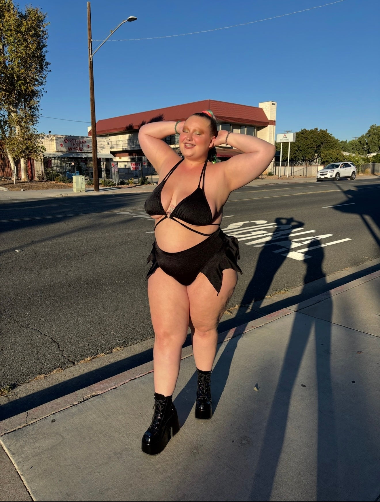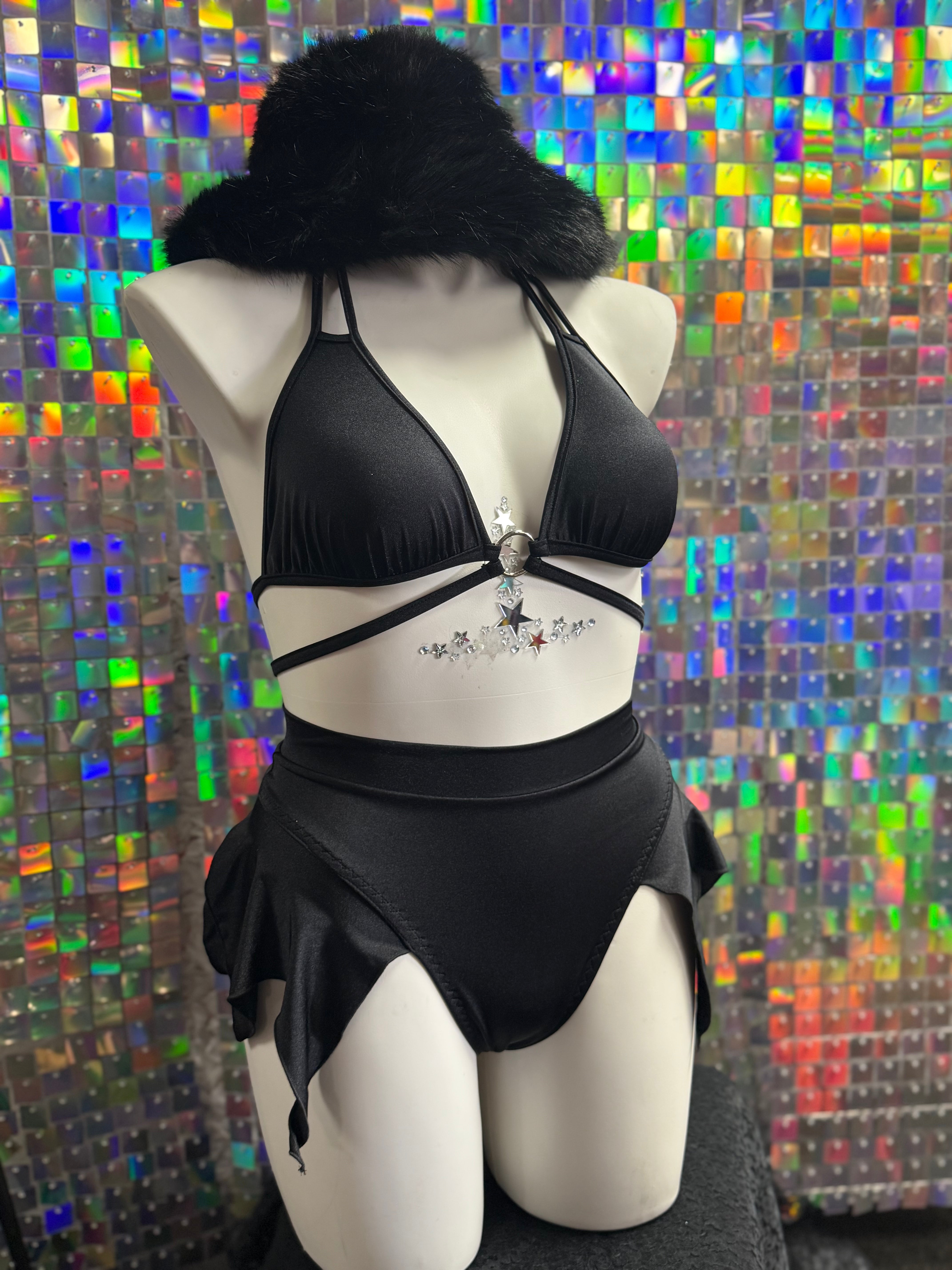 This dark, edgy set brings the heat — with jagged-cut bottoms that move with every step and a double-strap top that keeps you secure while serving major baddie energy.