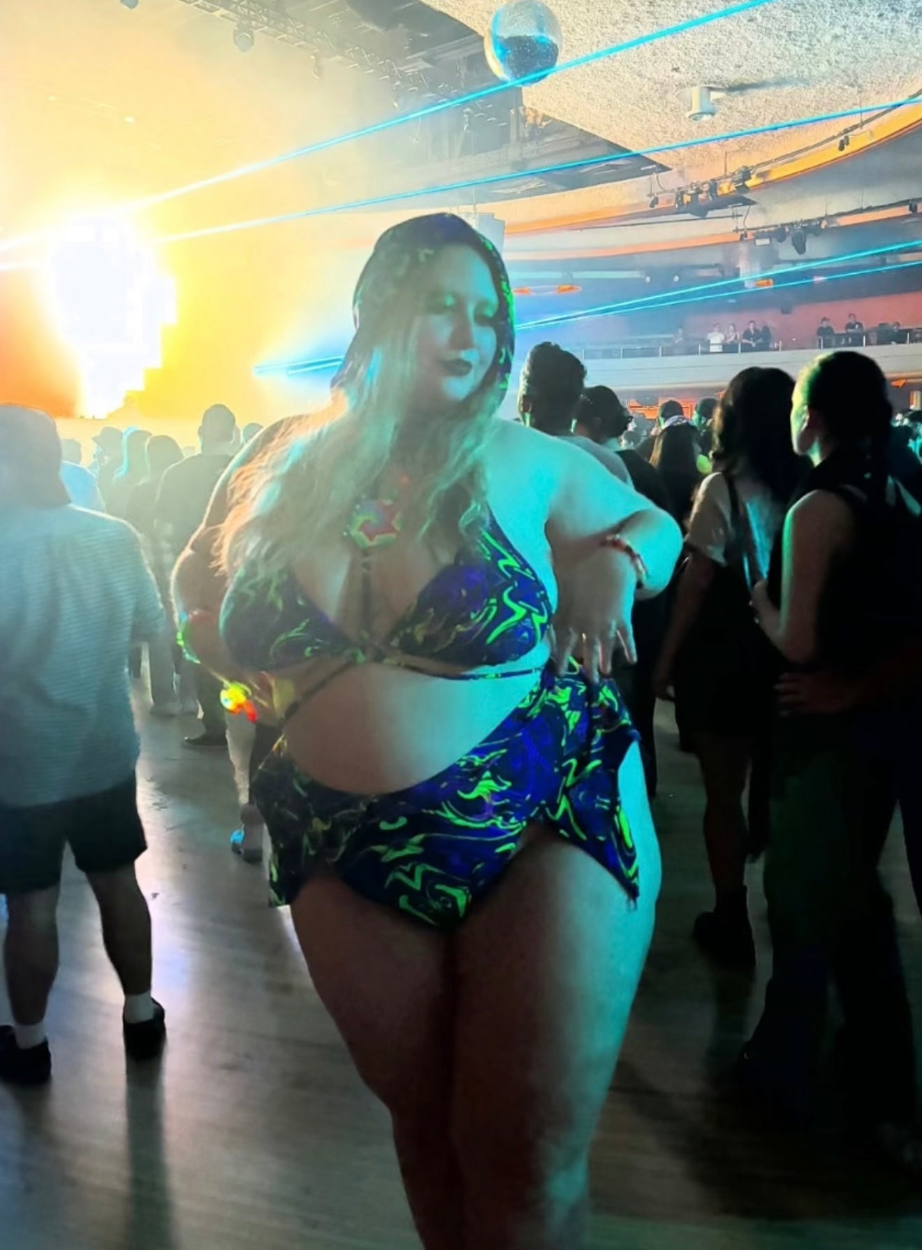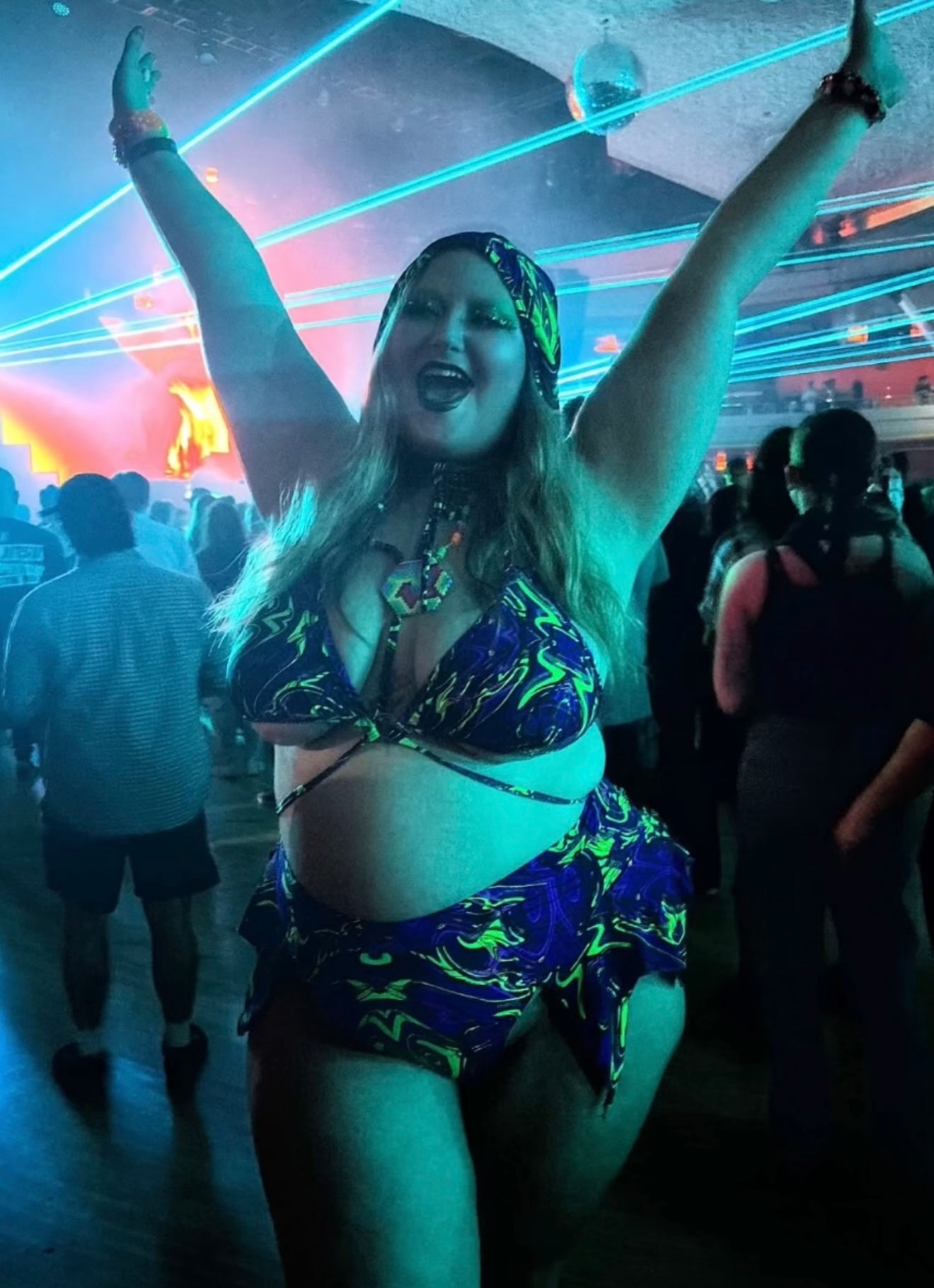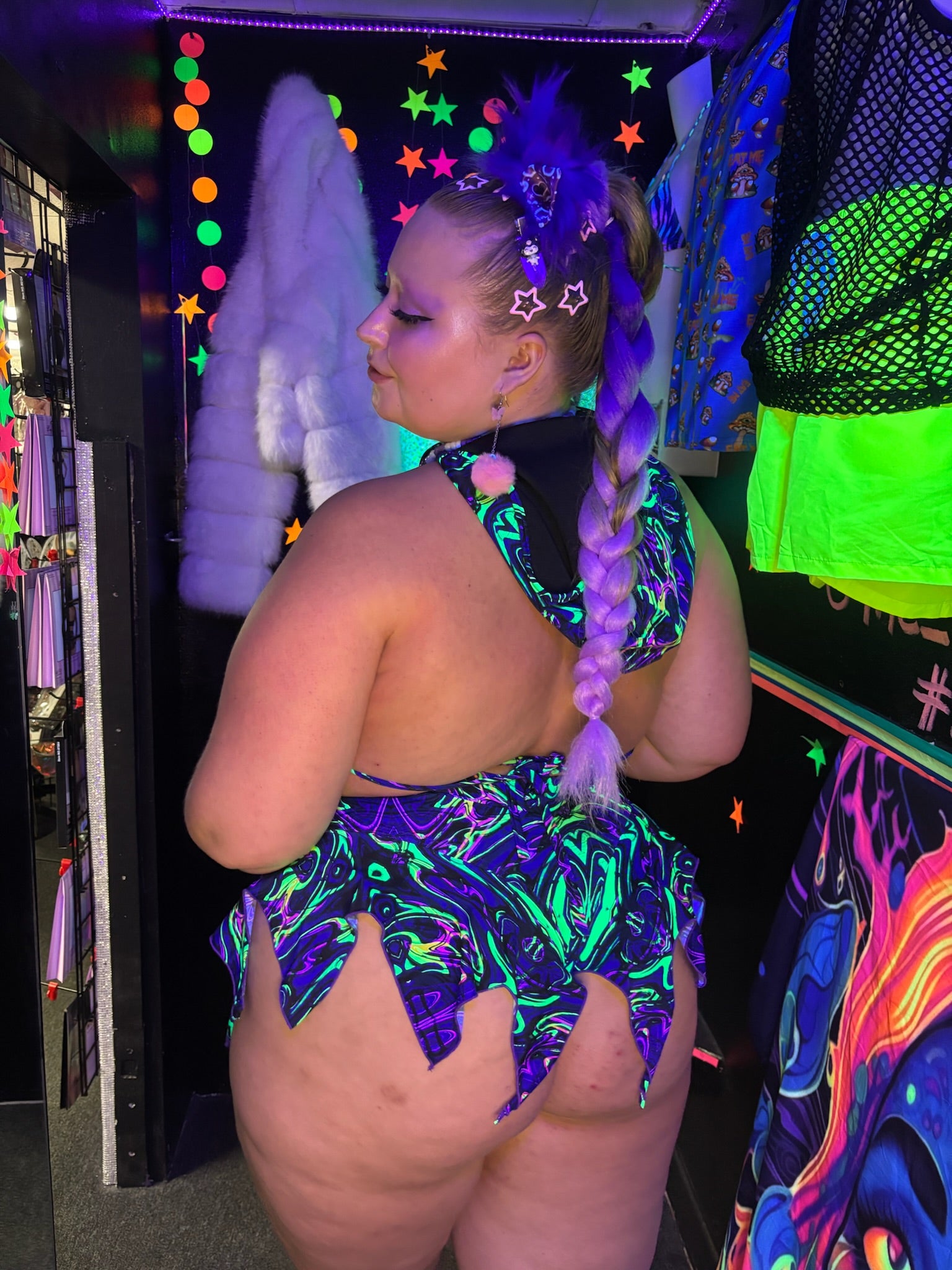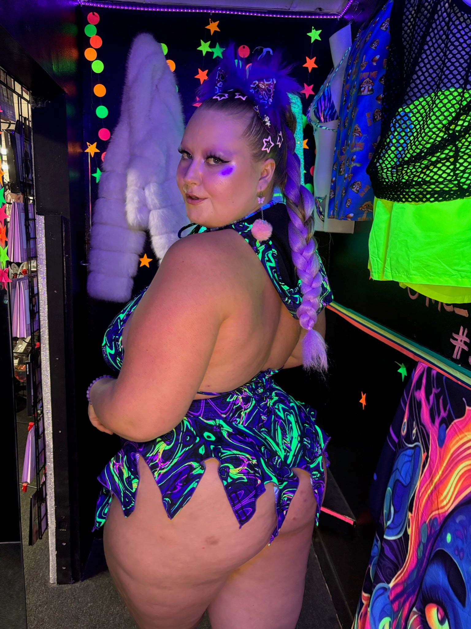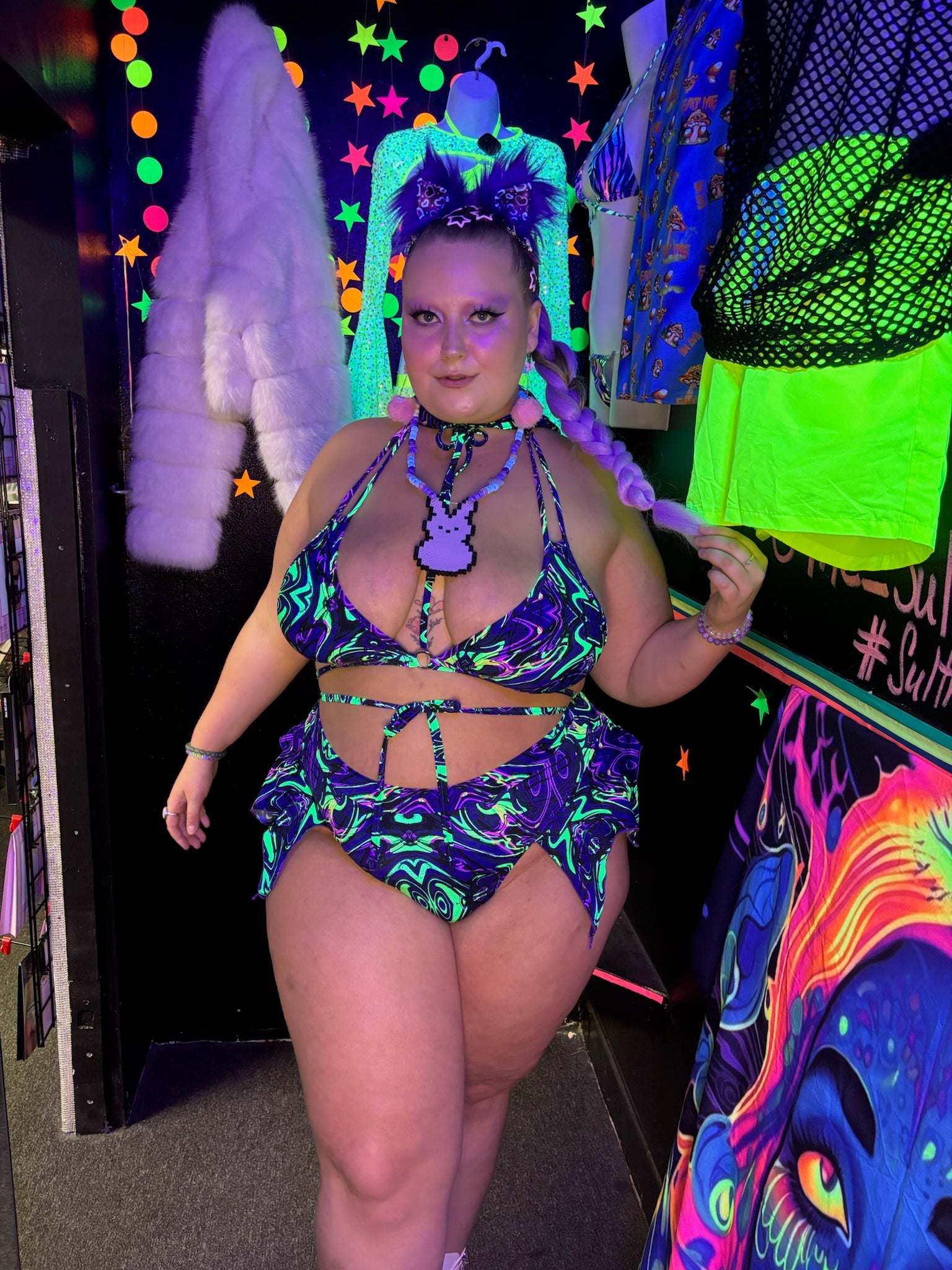 This bold, trippy set brings the heat — featuring jagged-cut bottoms that move with every step and a double-strap top that keeps you secure while serving major baddie energy.
