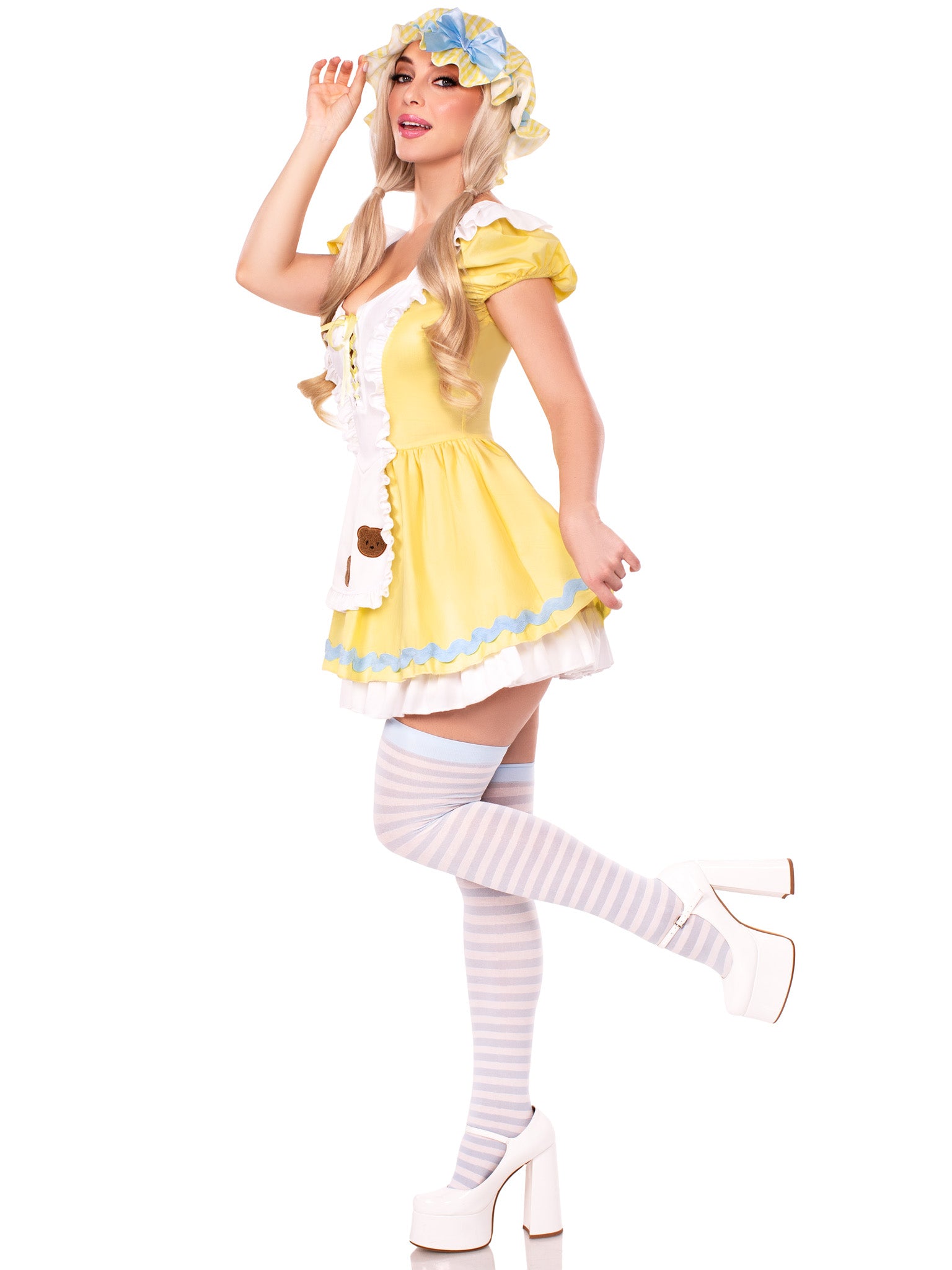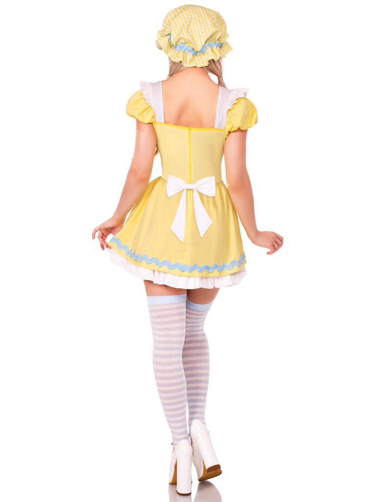 3 PC Beary-Cute Goldilocks Costume, Includes Apron Dress with Lace-Up Front and Bear Patches, Pin-On Back Bow, and Bonnet