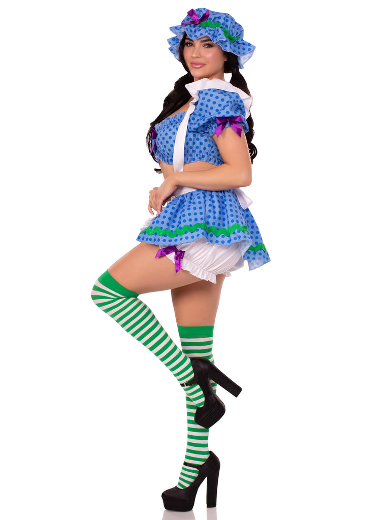 3 PC Blueberry Babe Costume, Includes Polka-Dot Crop Top, Suspender Skirt with Attached Bloomers, and Bonnet