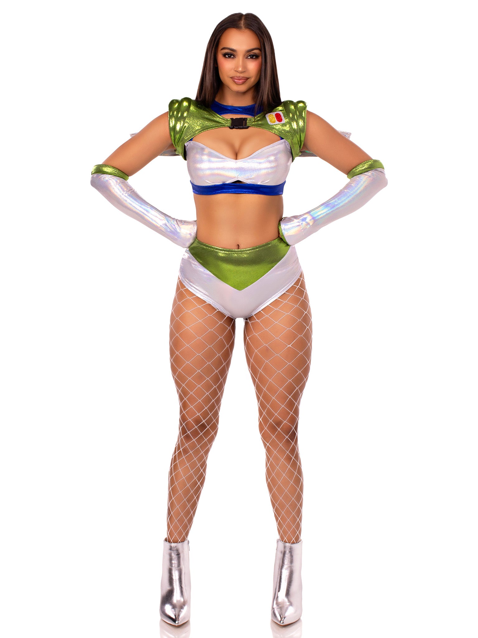4 PC Intergalactic Ranger Costume, Includes Holographic Crop Top, Wing Harness, Bottoms, and Fingerless Gloves