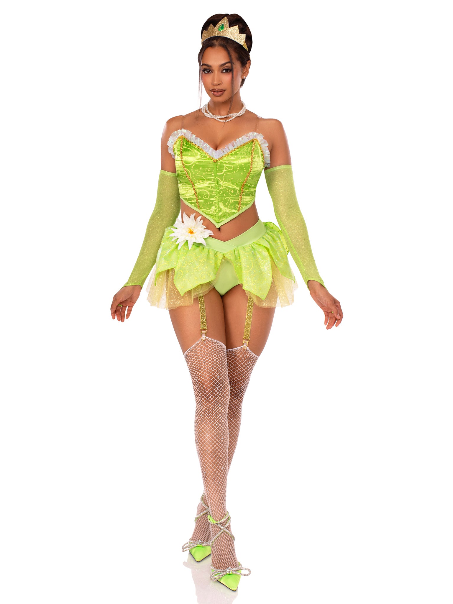 6 PC Bayou Babe Costume, Includes Ruffle-Trimmed Bustier Top, clear straps, Petal Skirt Garter Panty, Pin-On Flower, Shimmer Gauntlet Gloves, And Crown