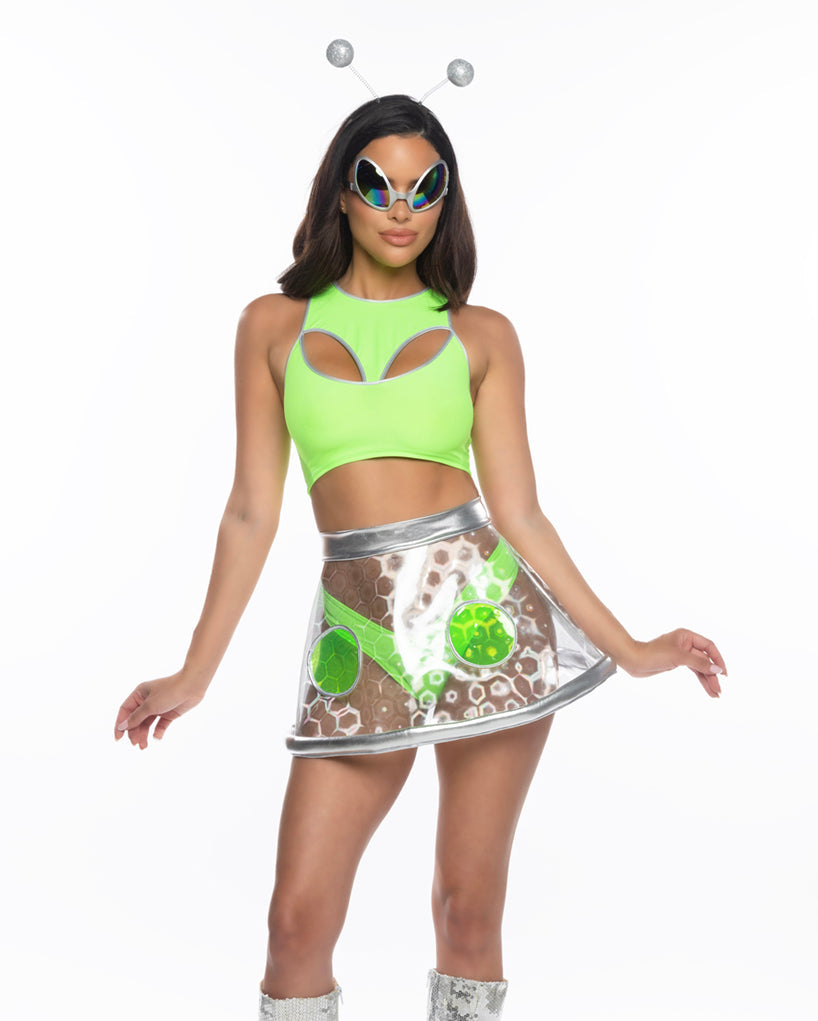 Includes: Knit cropped top, clear vinyl skirt, brazilian cut shorts, & headpiece