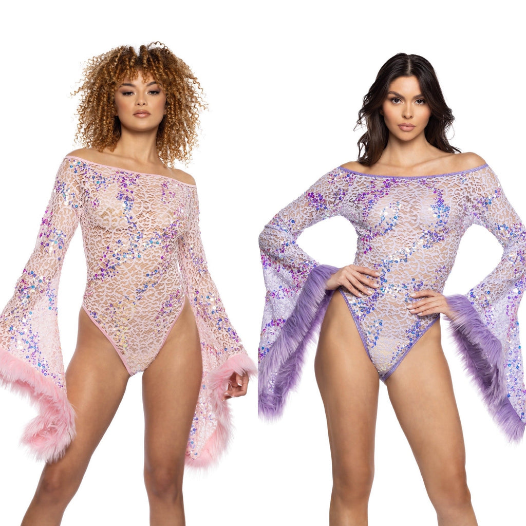 JR130 - Faux Fur Trimmed Flair Sleeve Bodysuit
