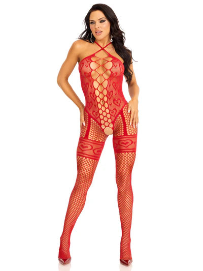 Halter Heart Net Crotchless Lingerie Jumpsuit with Leg Garter Detail