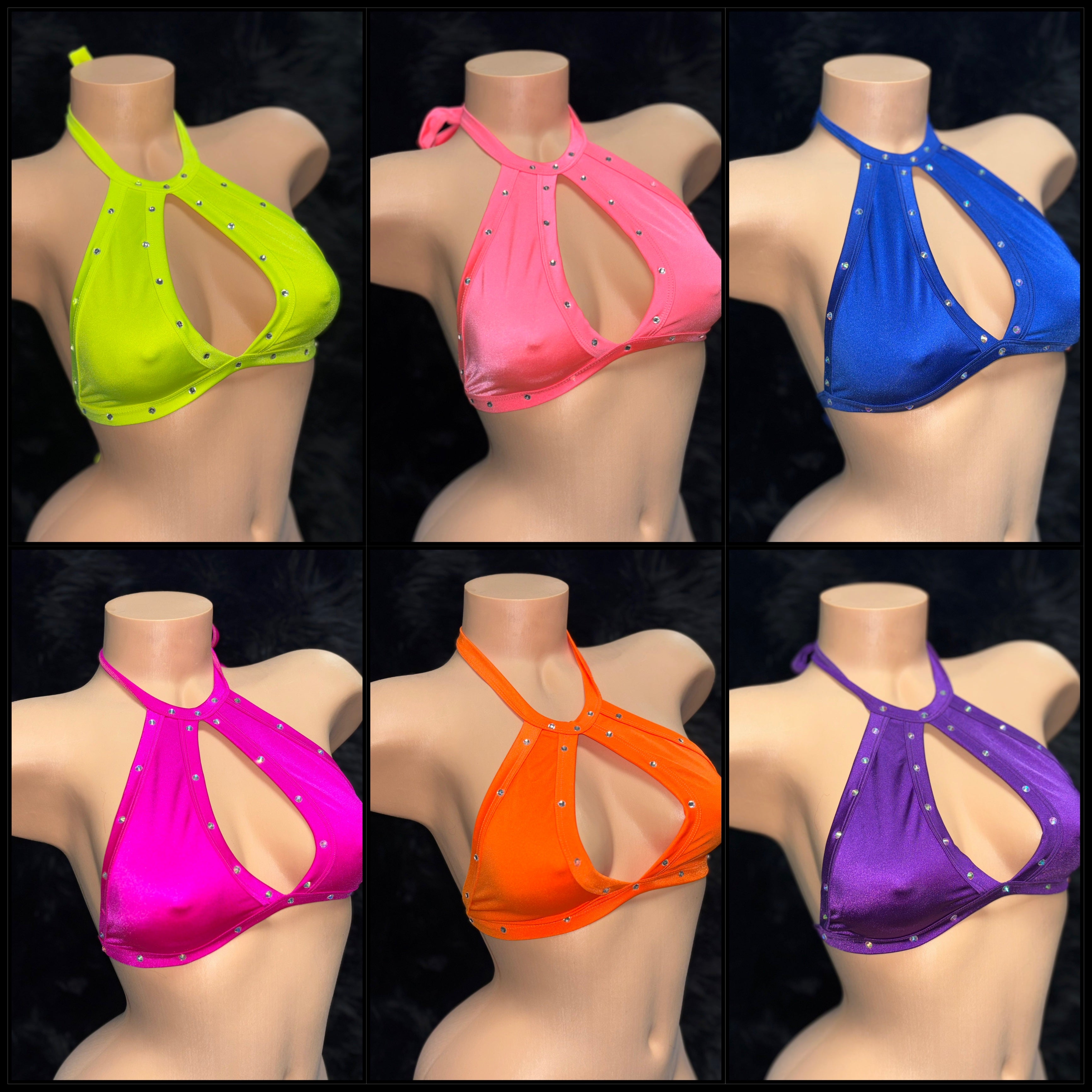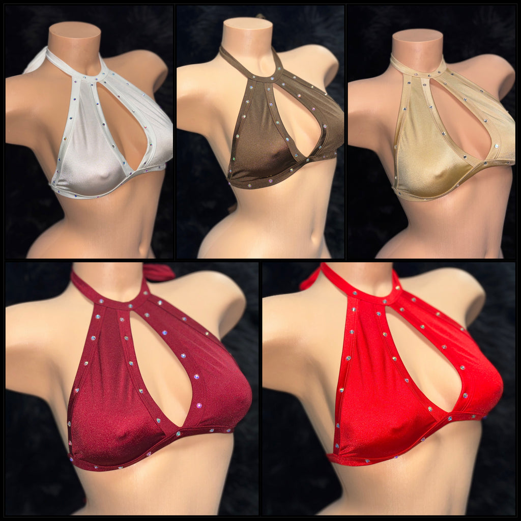 Add a touch of elegance to your wardrobe with our Keyhole Halter Tops, embellished with dazzling rhinestones.