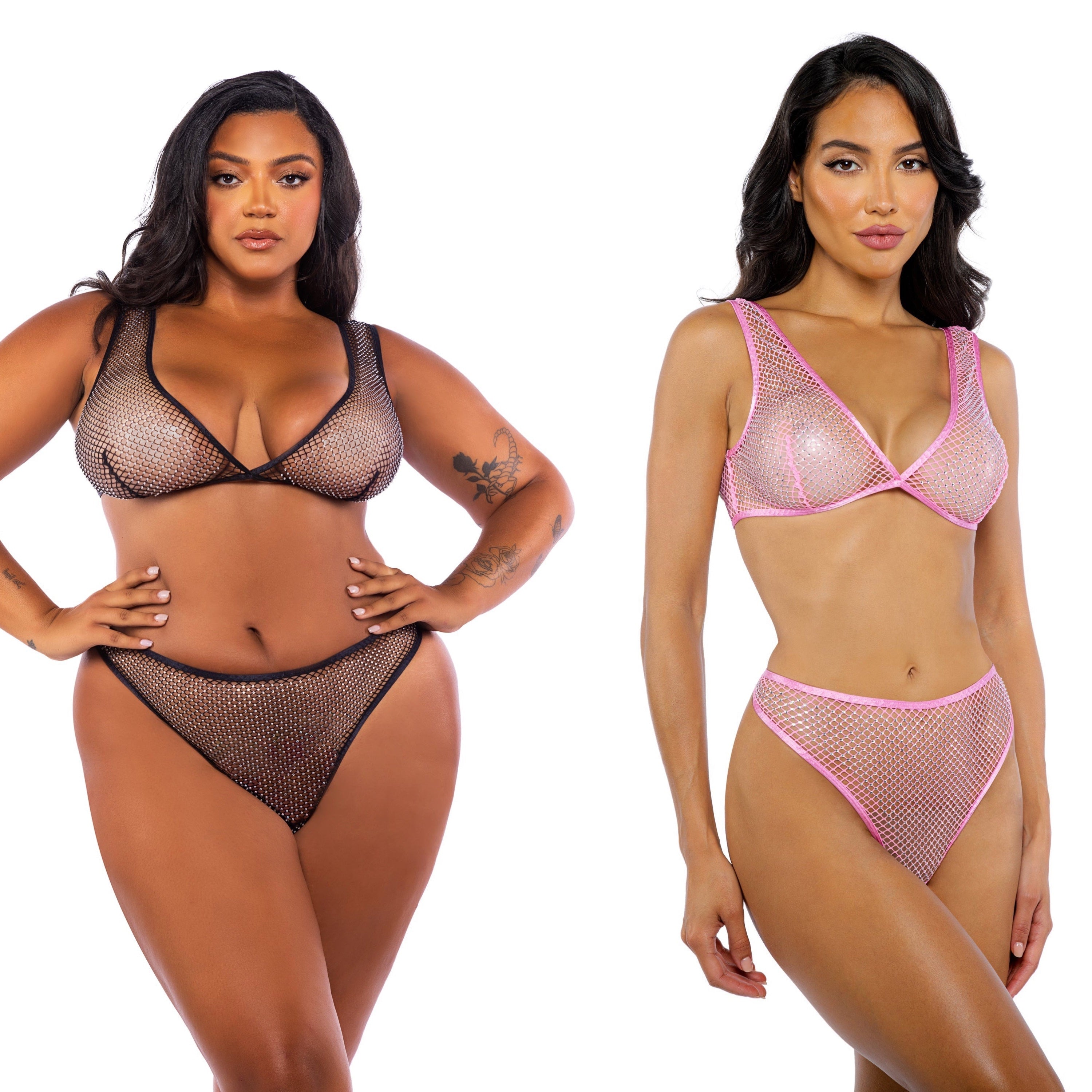 Plunge neckline, Rhinestone fishnet, Fold over elastic trim