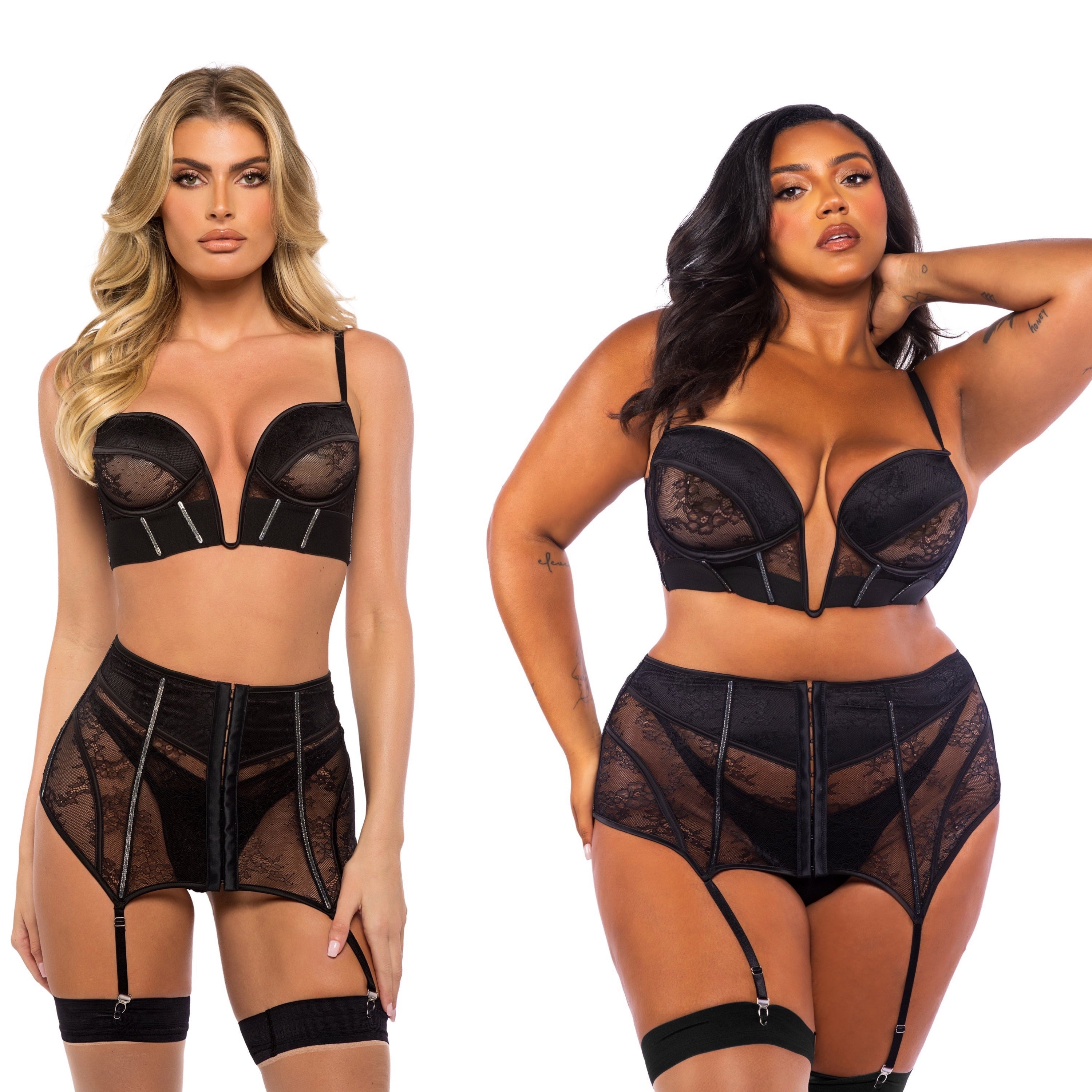 Chantilly lace and satin, Mesh back, Plunge v-wire, Balconette cup with underwire, Exposed steel boning detail, Hook and eye closure