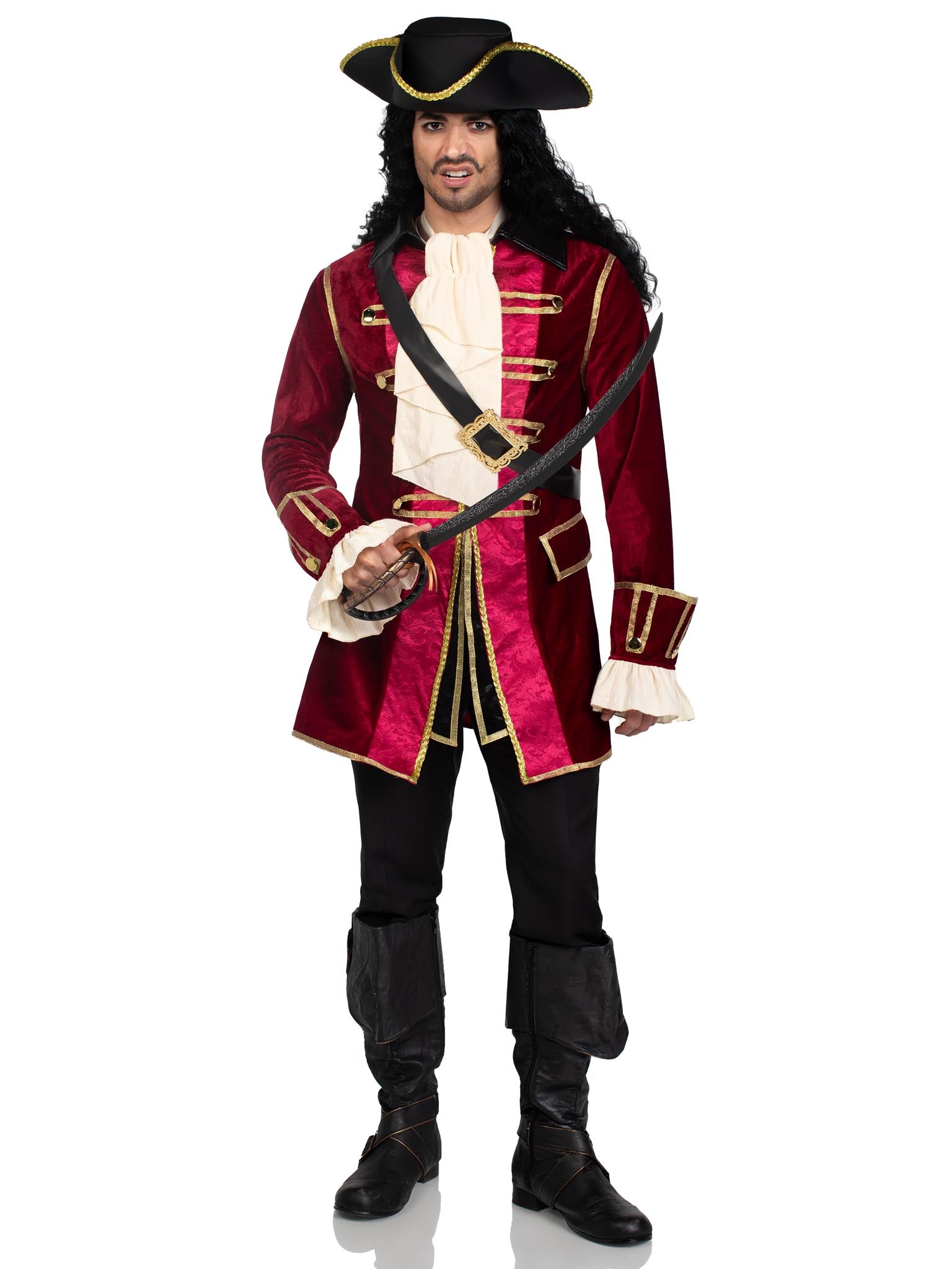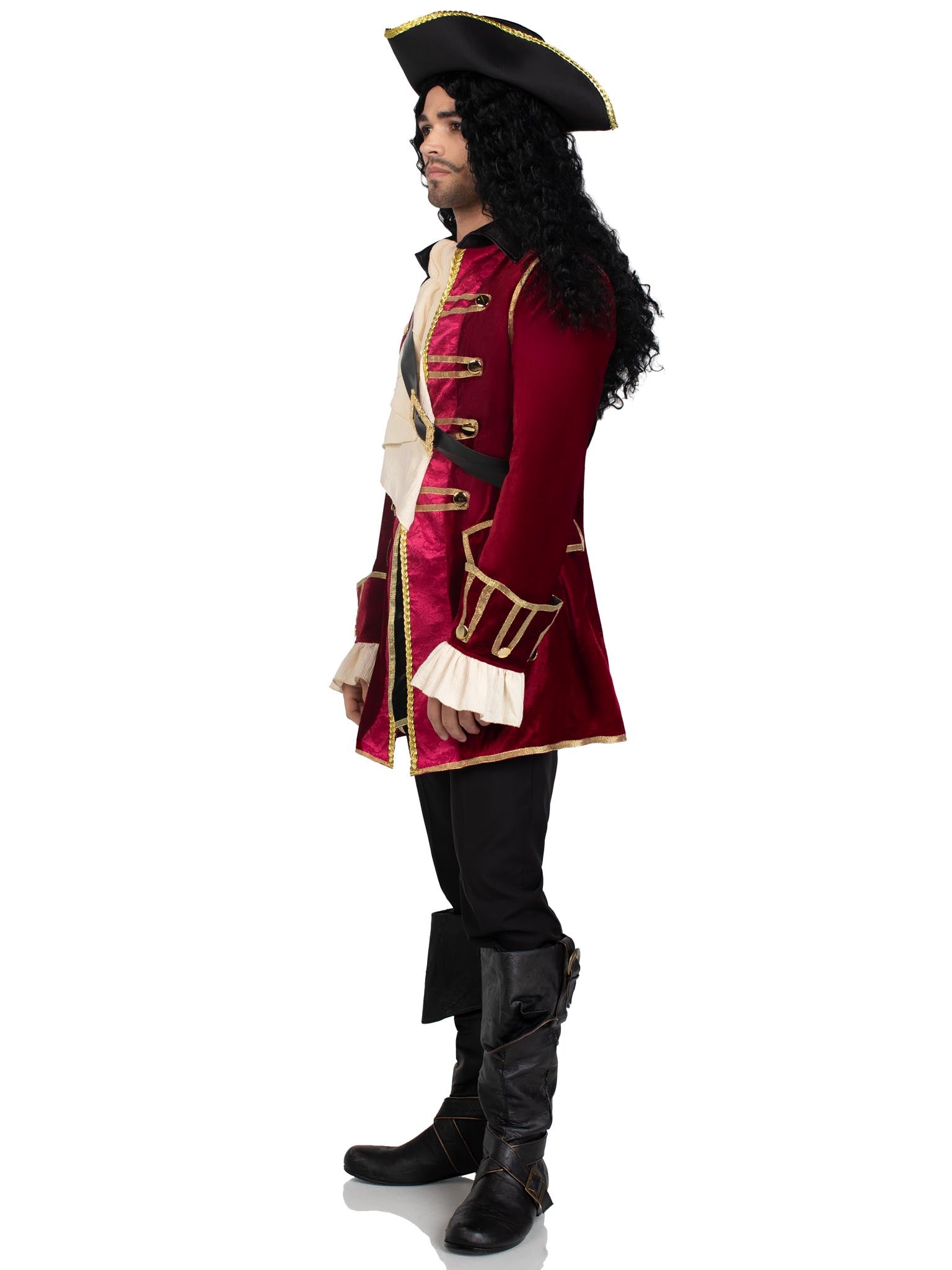 Men's 4 PC Pirate Captain Costume, Includes Gold Trimmed Velvet Coat, Jabot Neck Piece, Cross-Body Belt, and Pirate Hat