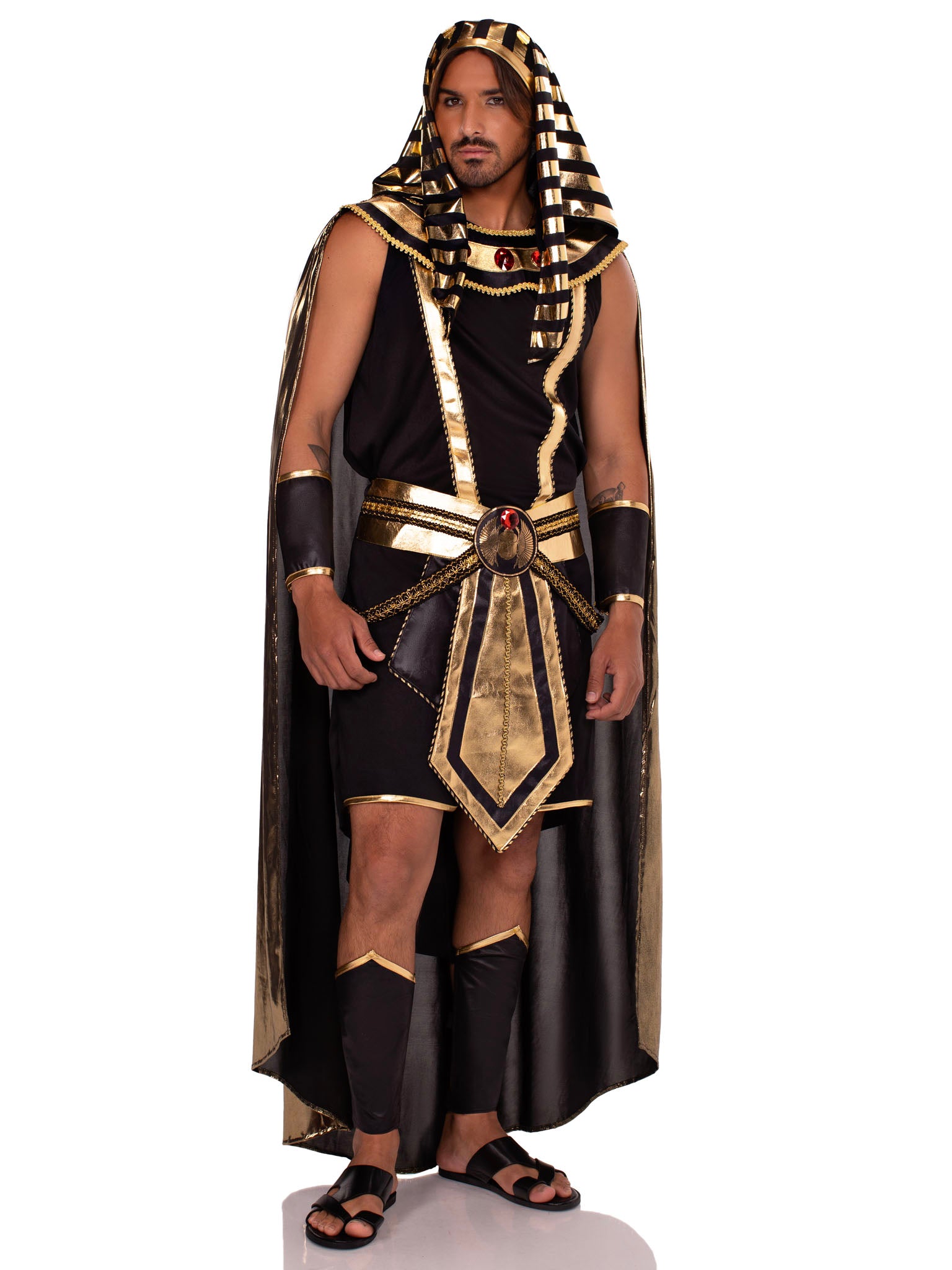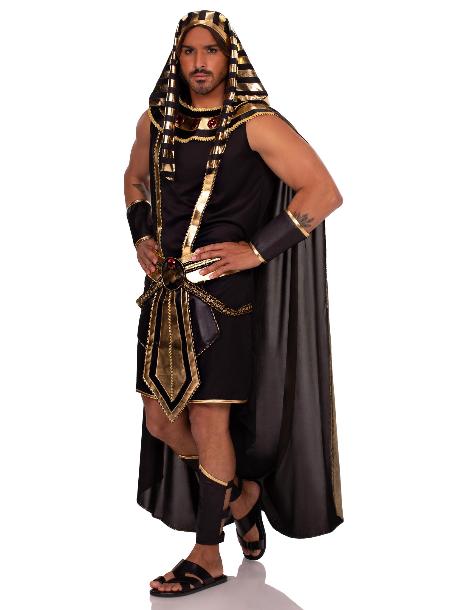 Men's 6 PC Pharaoh Costume, Includes Tank Top, Jeweled Collar with Attached Cape, Shorts with Attached Panel Belt, Wrist Cuffs, Leg Guards, and Head Piece