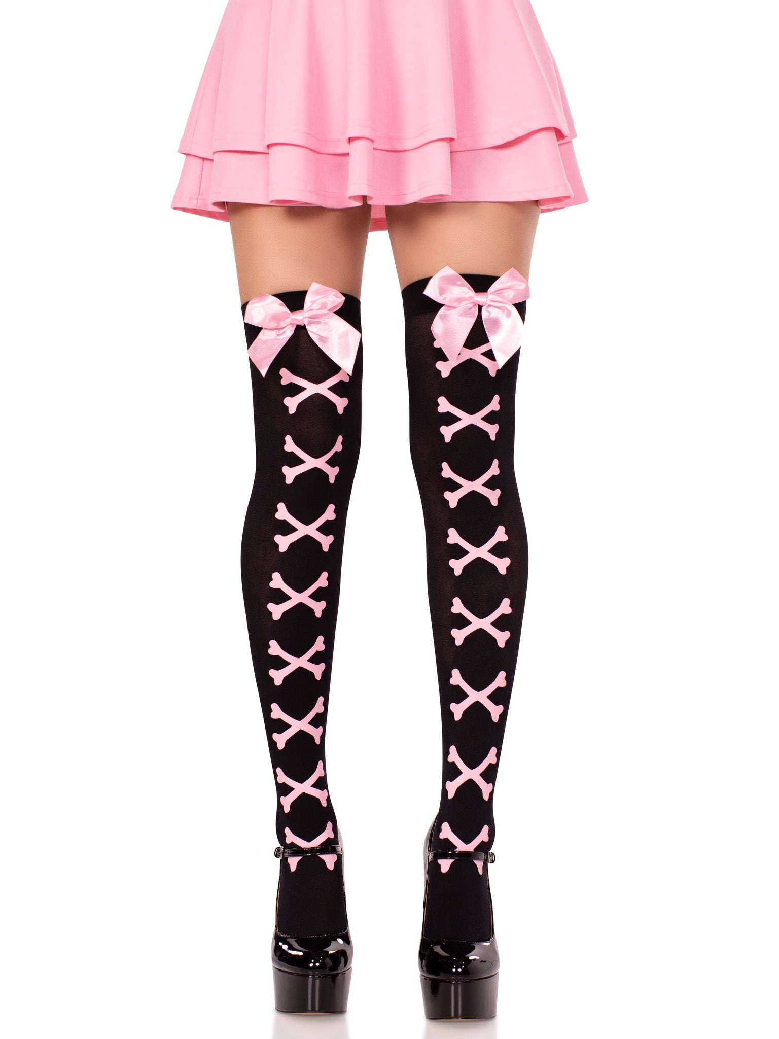 Opaque Cross Bone Thigh Highs with Satin Bow Accent
