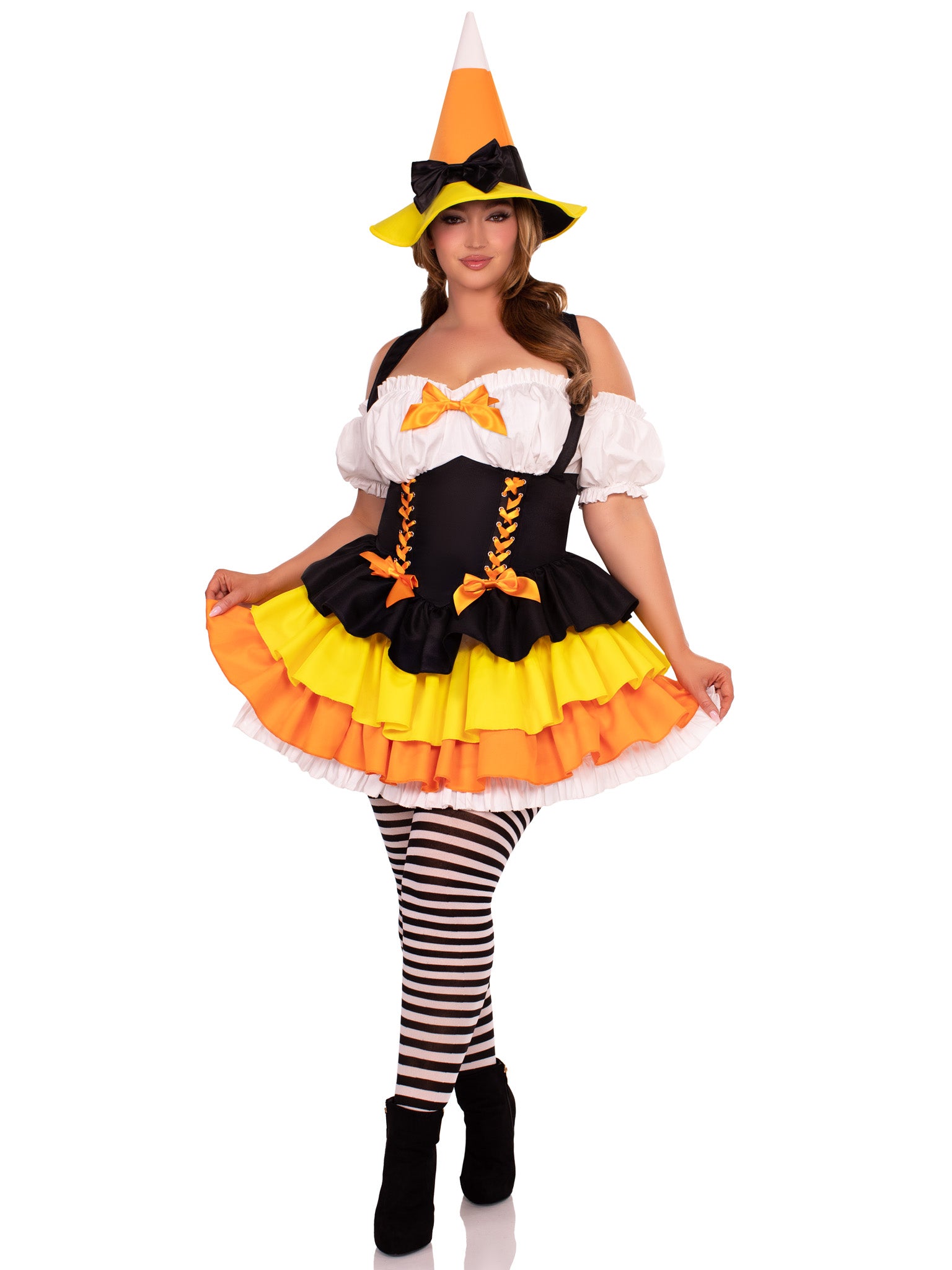 Plus Size 2 PC Candy Corn Witch Costume, Includes Dress with Tiered Skirt Lace-Up Waist and Witch Hat